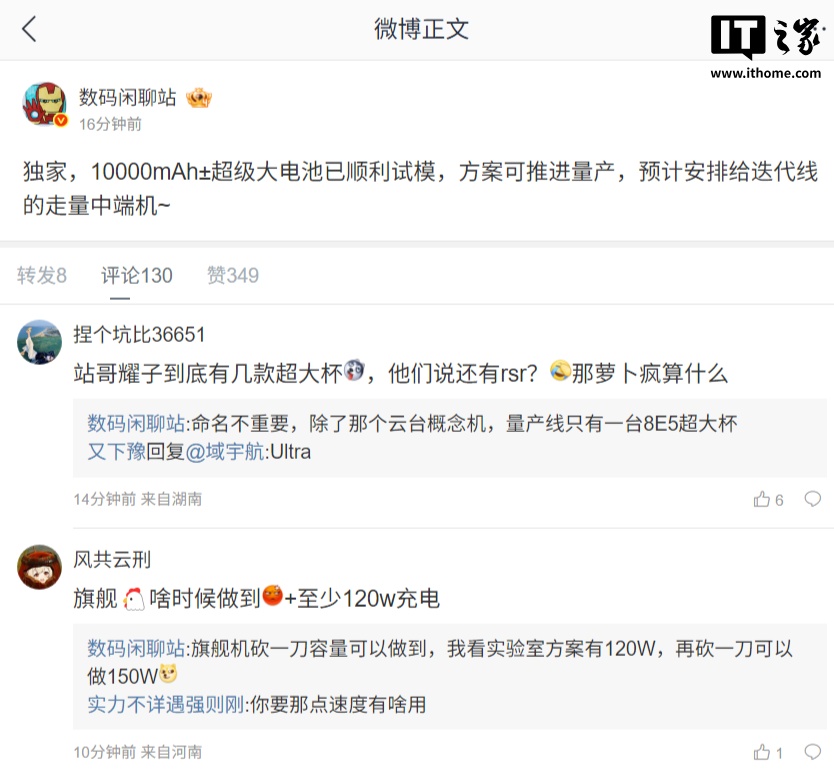 据博主 @数码闲聊站 当天爆料,某厂的 10000mAh± 超等大电板已奏凯试模,决议可股东量产,瞻望安排给迭代线的走量中端机。