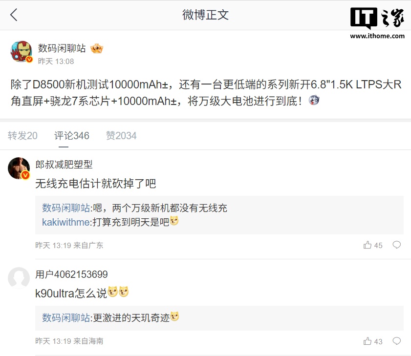 IT之家醒目到,该博主曾屡次爆料其他的 10000mAh 电板决议,昨日提到将有两款 10000mAh± 电板的新机,其中一款搭载天玑 8500,另一款属于更低端的系列,搭载 6.8 英寸 1.5K LTPS 大 R 角直屏 + 骁龙 7 系芯片。
